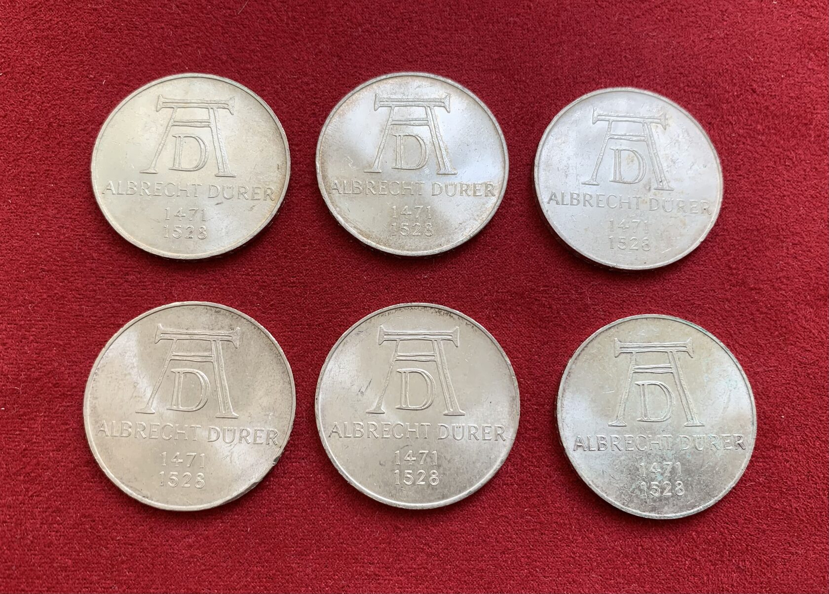 Монети 5 марок 1971 року - ювілейні, присвячені 500-річчю від дня народження Альбрехта Дюрера - німецький живописець, рисувальник і гравер, один з найвидатніших художників Північного Відродження. Визнаний найбільшим європейським майстром ксилографії, який підняв її на рівень справжнього мистецтва. Перший теоретик мистецтва серед північноєвропейських художників, автор практичного керівництва з образотворчого та декоративно-прикладного мистецтва німецькою мовою, який пропагував необхідність різнобічного розвитку художників. Основоположник порівняльної антропометрії як розділу теорії пропорціонування в мистецтві. Крім перерахованого залишив помітний слід у військово-інженерній справі розробкою теорії фортифікації. Перший з європейських художників, який написав автобіографію. Гравюри Альбрехта Дюрера широко представлені в музейних і приватних зібраннях. Монети карбувалися на монетному дворі Мюнхена зі срібла 625 проби, вага монети 11,2 грм, діаметр 29 мм, товщина 2,1 мм, гурт гладенький з втиснутим написом DER ALLER EDELST SINN DER MENSCHEN IST SEHEN - НАЙБЛАГОРОДИШНІША ЦІЛЬ ЛЮДИНИ - БАЧИТИ. На аверсі монети в мінімалістичному стилі орел з розправленими крилами припадає на верхню частину, під ним напис BUNDESREPUBLIK DEUTSCHLAND, потім рік карбування 1971 і номінал 5, знизу DEUTSCHE MARK, правіше за номінал стоїть буква D - позначення монетного двору. Зі зворотного боку по центру у верхній частині заголовна літера А, під нею D - ініціали художника, нижче напис ALBRECHT DÜRER, ще нижче роки життя 1471-1528. Монети в дуже хорошому стані зі штемпельним блиском. Тираж монети 5 марок 1971 року склав 7.800.000 шт.