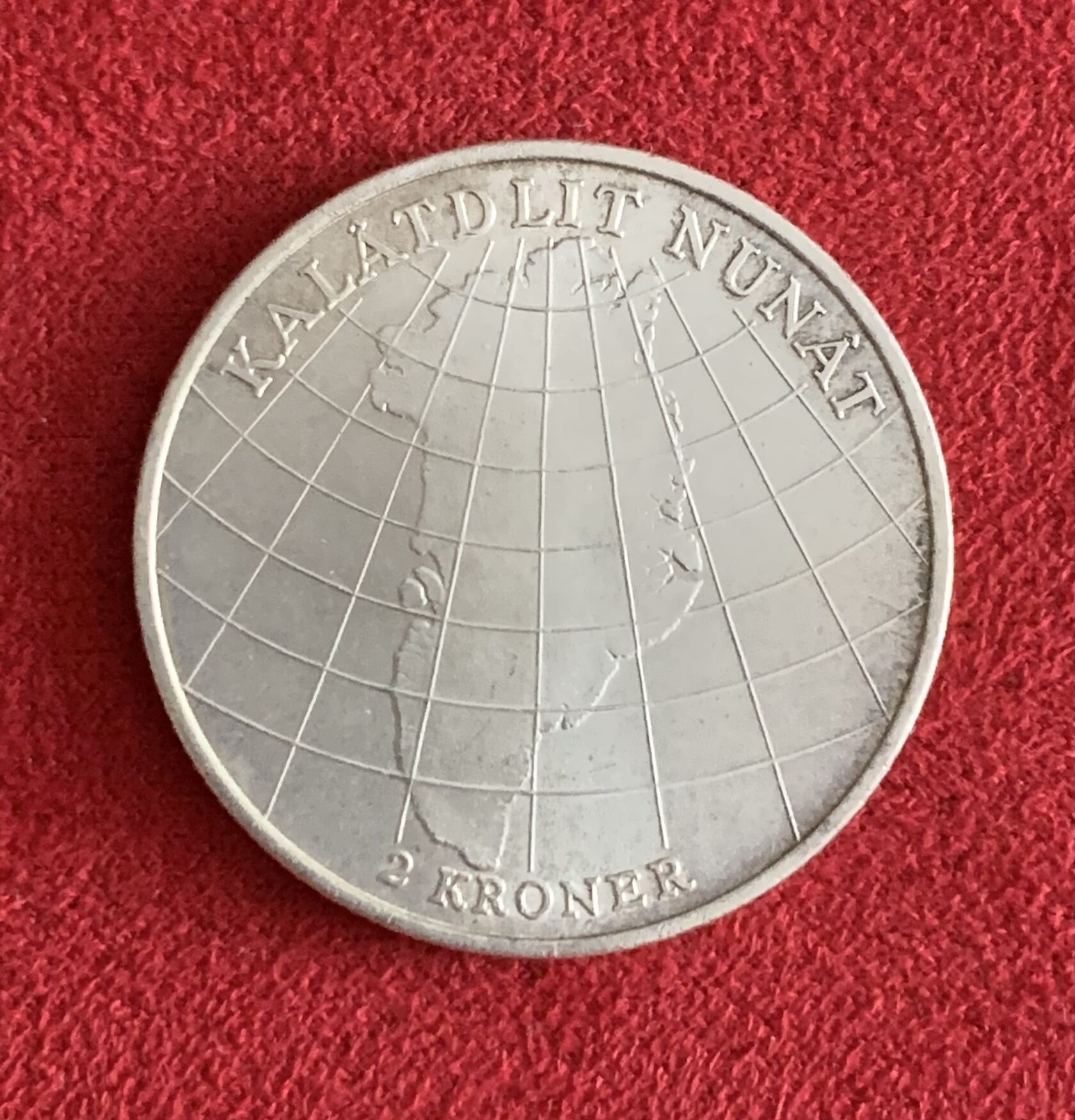 Монета 2 крони 1953 року - колекційна, присвячена компанії, що стартувала проти туберкульозу в Гренландії - найбільшому острові, що входить до складу Данського королівства, була випущена тиражем 151.710 шт, чеканилася зі срібла 800 проби, вага монети 13 мм, гурт рубчастий. На аверсі монети профіль короля і королеви, повернені вправо, вздовж бортика напис KONG FREDERIK IX DRONNING INGRID AF DANMARK, в самому низу прописаний рік карбування 1953 року. , в самому верху вздовж борту напис KALATDLIT NUNAT, в самому низу прописано номінал 2 KRONER. Монета була в мінімальному обороті, без притертостей, місцями по периметру є тимчасова патина.
